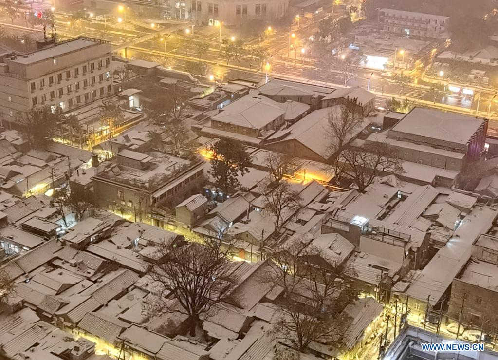 BEIJING, 7 novembre (Xinhua) -- Un quartier résidentiel traditionnel au milieu des chutes de neige à Beijing, capitale de la Chine, le 6 novembre 2021. De fortes chutes de neige ont touché Beijing samedi, et ont engendré une baisse des températures. (Photo : Luo Xiaoguang)
